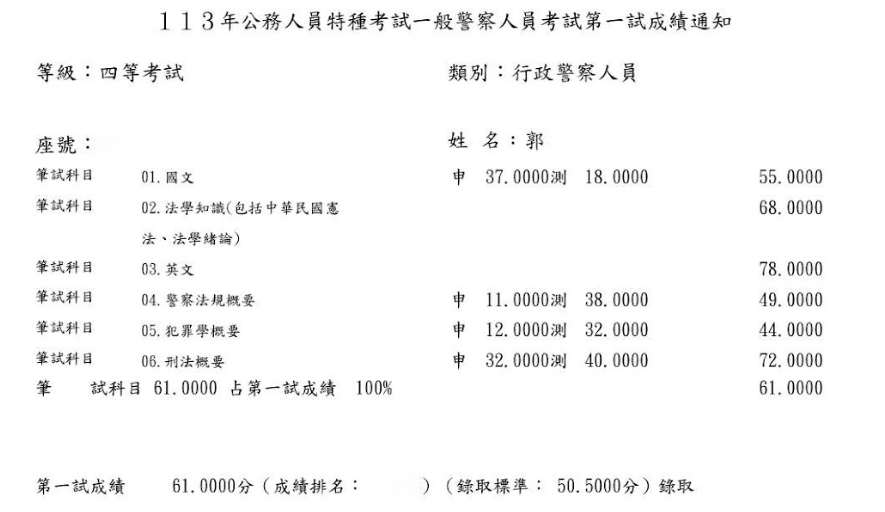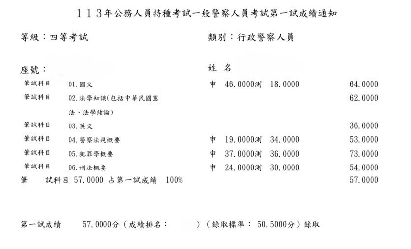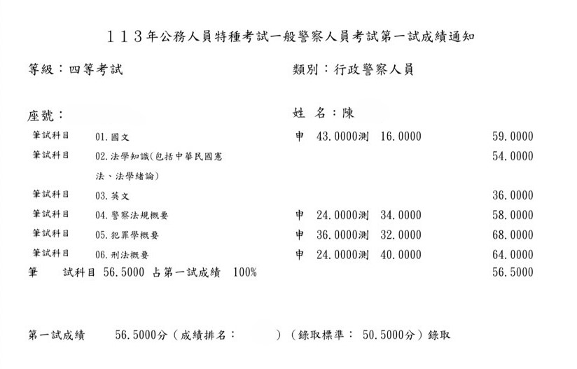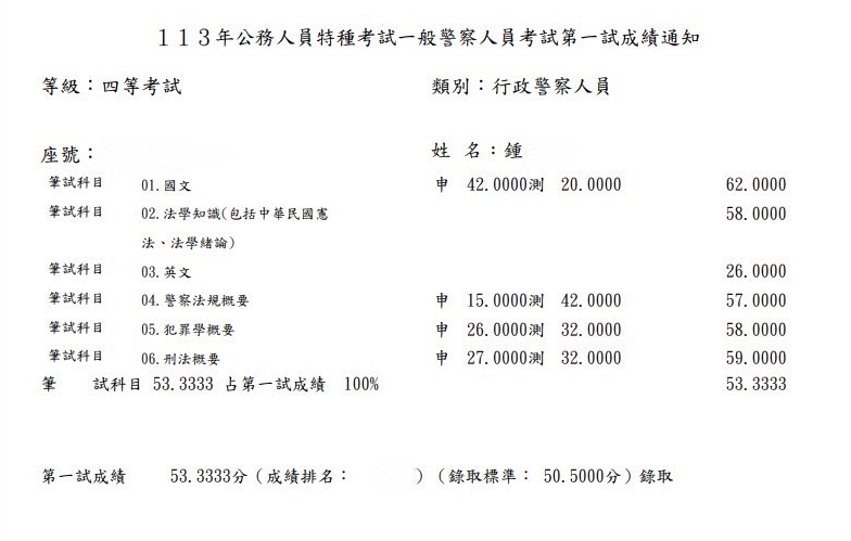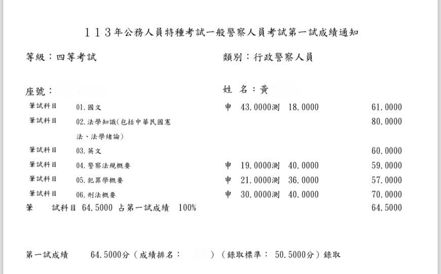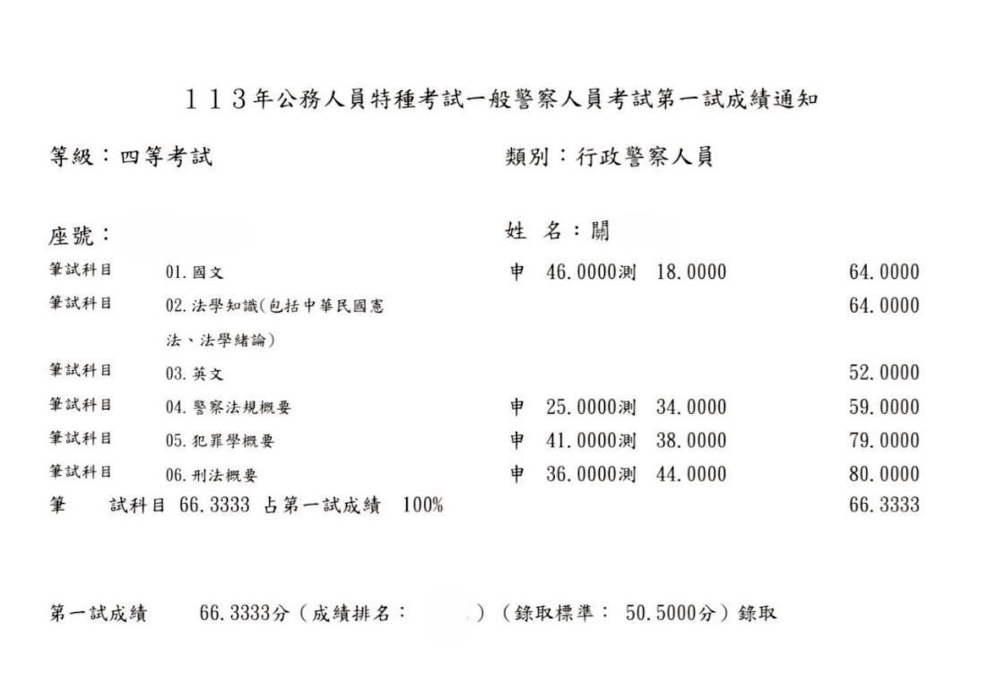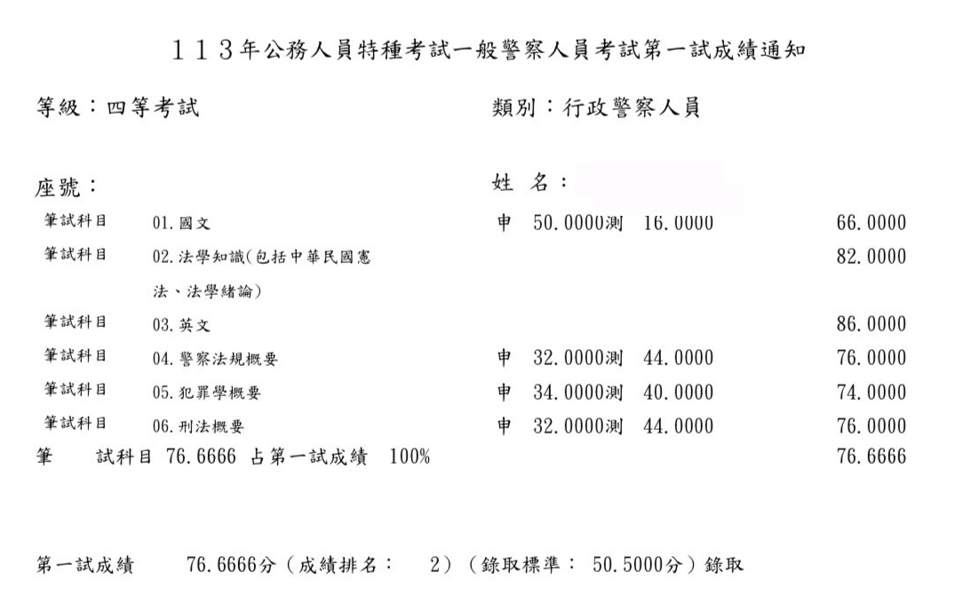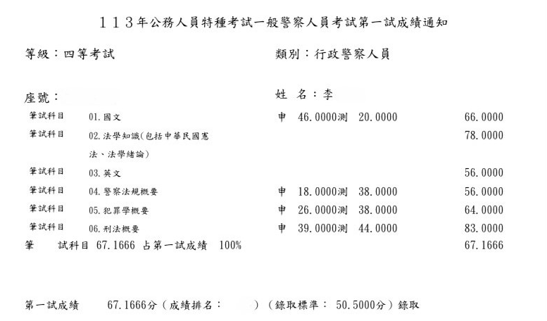 我從今年的1月中旬左右開始準備,剛開始就選擇自讀,爬文買書回家自己準備以及購買阿摩VIP,早上會選擇刑法或犯罪學比較需要耗費精神去記憶的科目,下午則針對警察法規,在4月時經朋友推薦購買思法人總複習班,針對專業科目加強,真的是靠總複習班把重點聚焦,前面自讀很容易抓不到重點而且會花費很多心力去搞懂,上了總複習後才覺得蠻後悔沒有一開始報名正課班,可以直接針對重點熟讀,不需要再花費時間在冷門的部分,我選擇了一個痛苦的方式,不然分數跟名次應該會再進步不少,說真的是靠總複習班將我的分數衝上來。