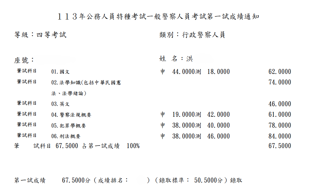 (一)報考年度、類科及各科成績