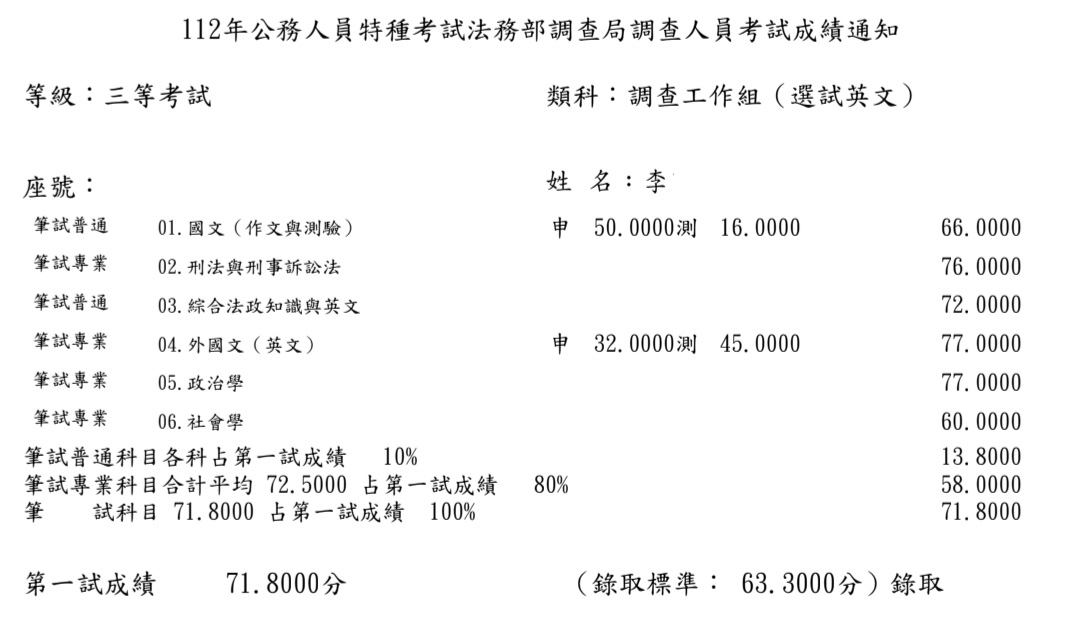 4、過往國考經歷:108年調查局三等筆試通過,109年調查局三等筆試通過,但皆未獲錄取。110年差2.1分落榜,111年又差1.1分落榜,幾乎要放棄。