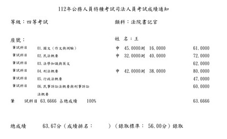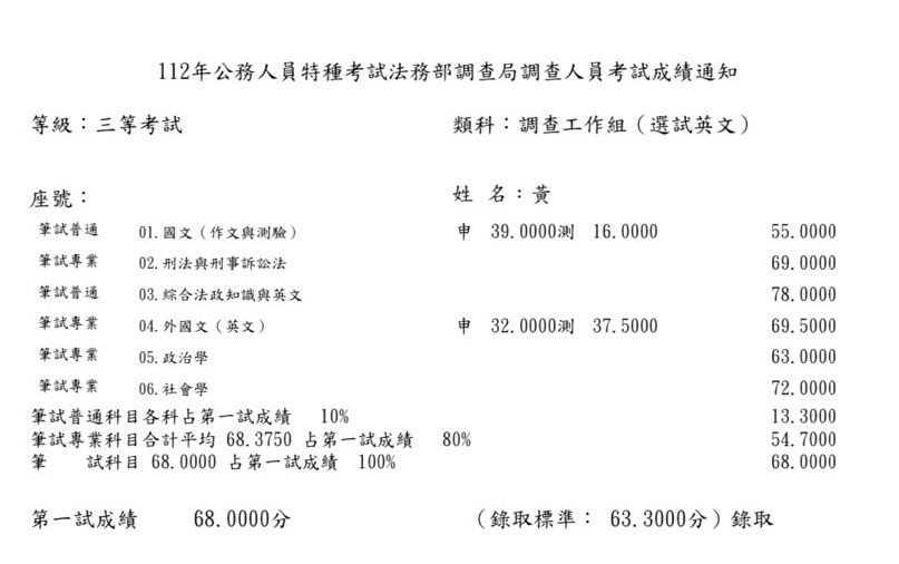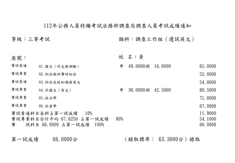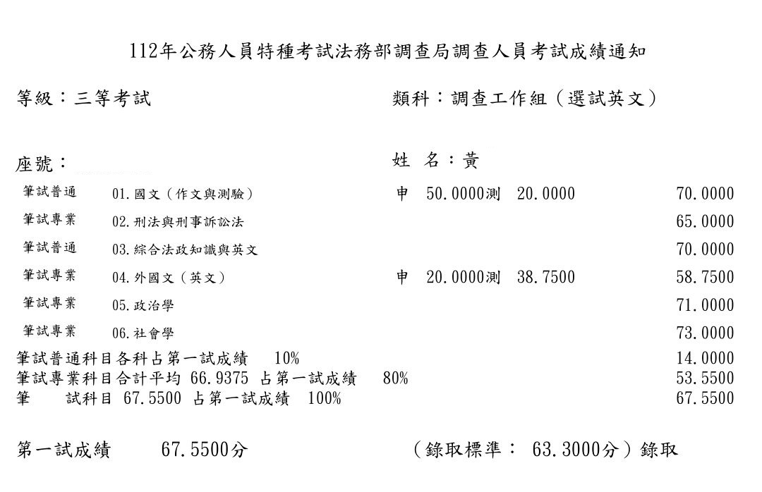 4、過往國考經歷:108年調查局三等筆試通過,109年調查局三等筆試通過,但皆未獲錄取。110年差2.1分落榜,111年又差1.1分落榜,幾乎要放棄。