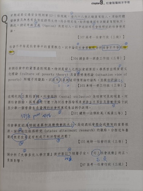 誠如上述,國考就是申論的功夫,我會先認知到輸出知識的重要性,再去理解跟(不可避免的)記憶考古題的架構,而不是抓著課本或題庫書奉為聖經瞎背。因為考古題是活的,換種問法,可能回答的就會有所差別。另外,以社會學為例,純靠單純記憶某「名詞」、某「理論」的方式難以得高分。借用老師在解題班(題庫班)中談到的解題步驟,向上聯想、向下延伸、寫出架構、「社會學語言的標題」,精準的學者與解釋→這些共同構成了最後的「得分」。所以如果以往社會學總是「差那麼一點」的分數的感覺,或許可以反推自己到底是哪一個步驟出現問題,是聯想不到上層理論?延展不了時事、台灣現象?還是理論與實際扣連不了?寫作結構鬆散……仔細想想自己到底是哪一步出了問題,或許就能夠突破以往總是「差一點點」的社會學成績。
