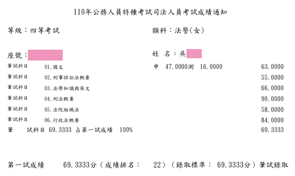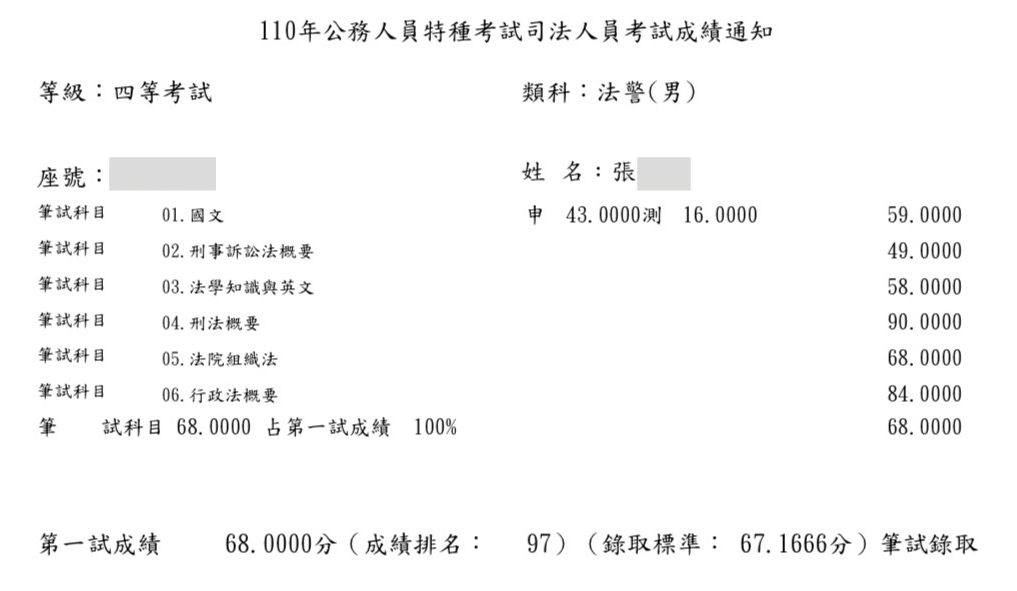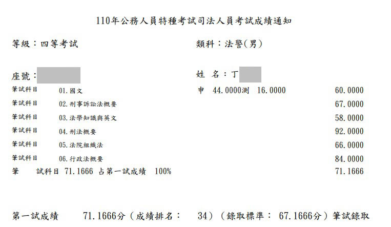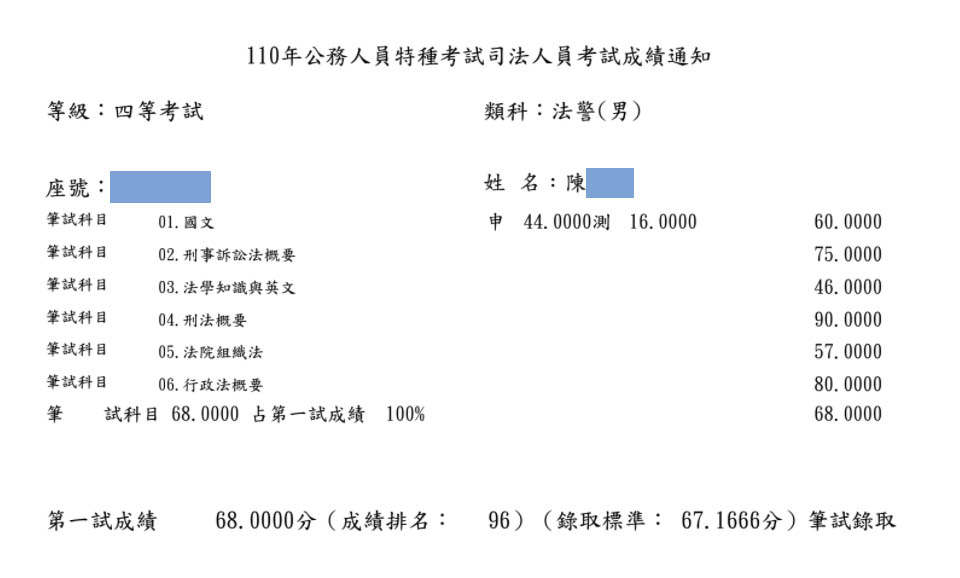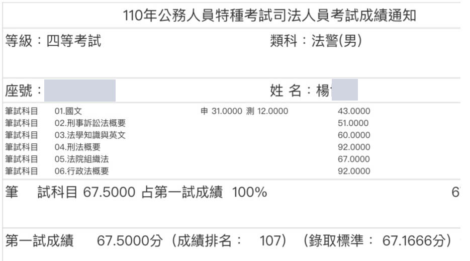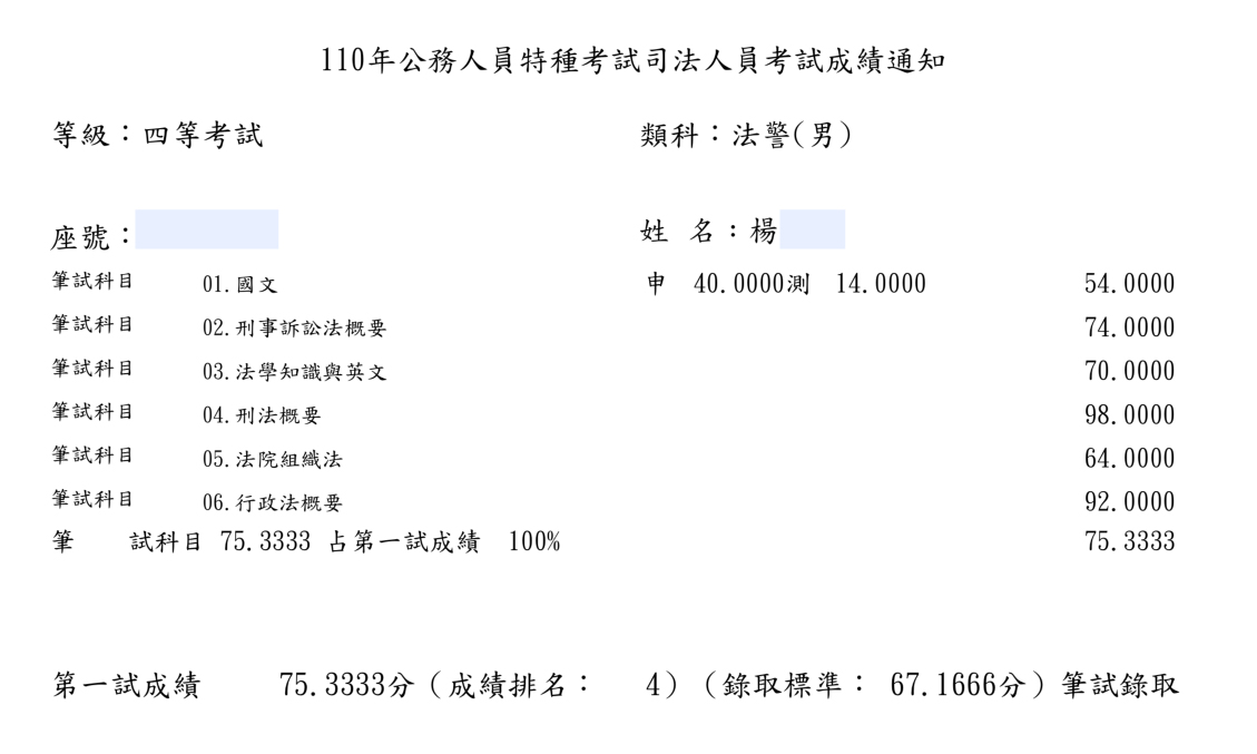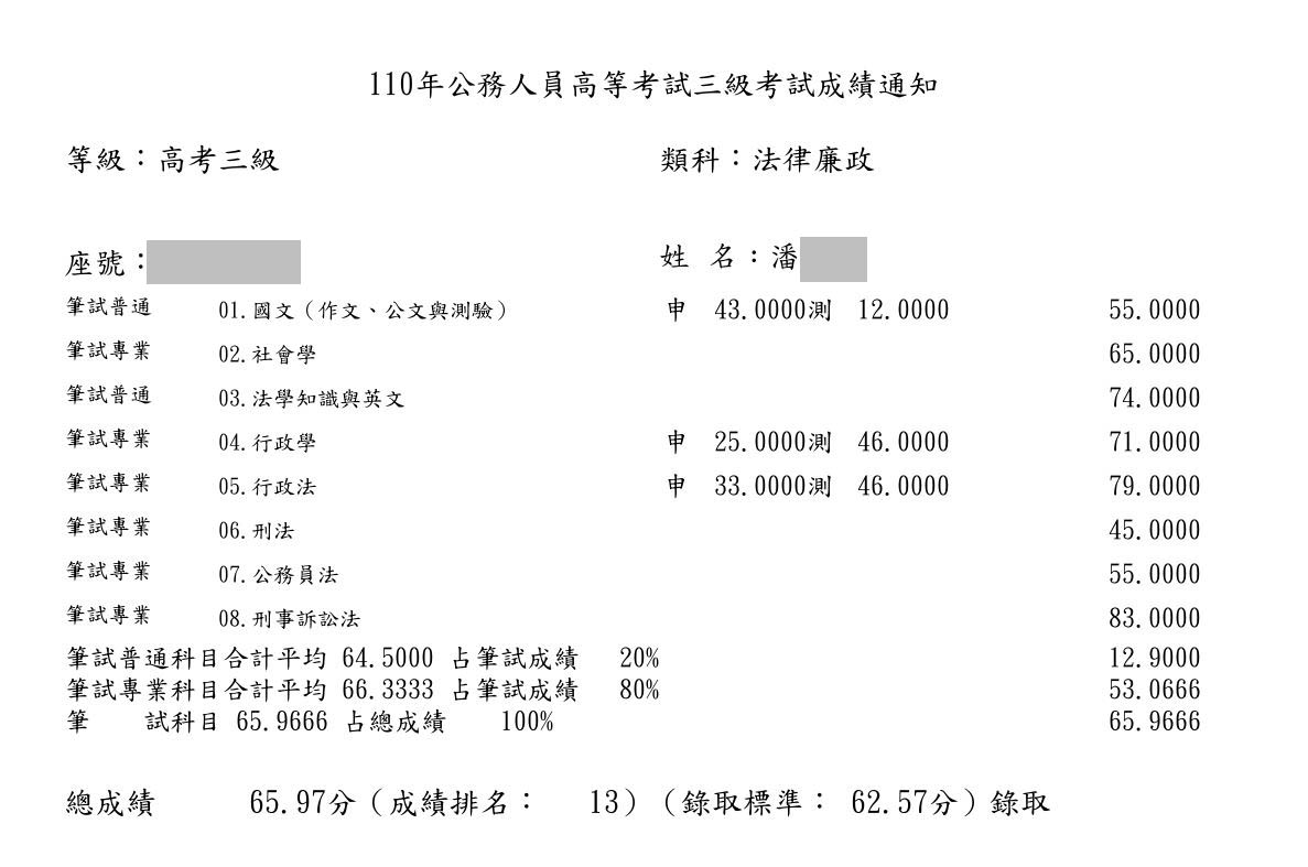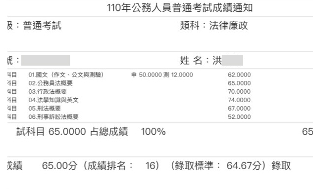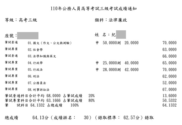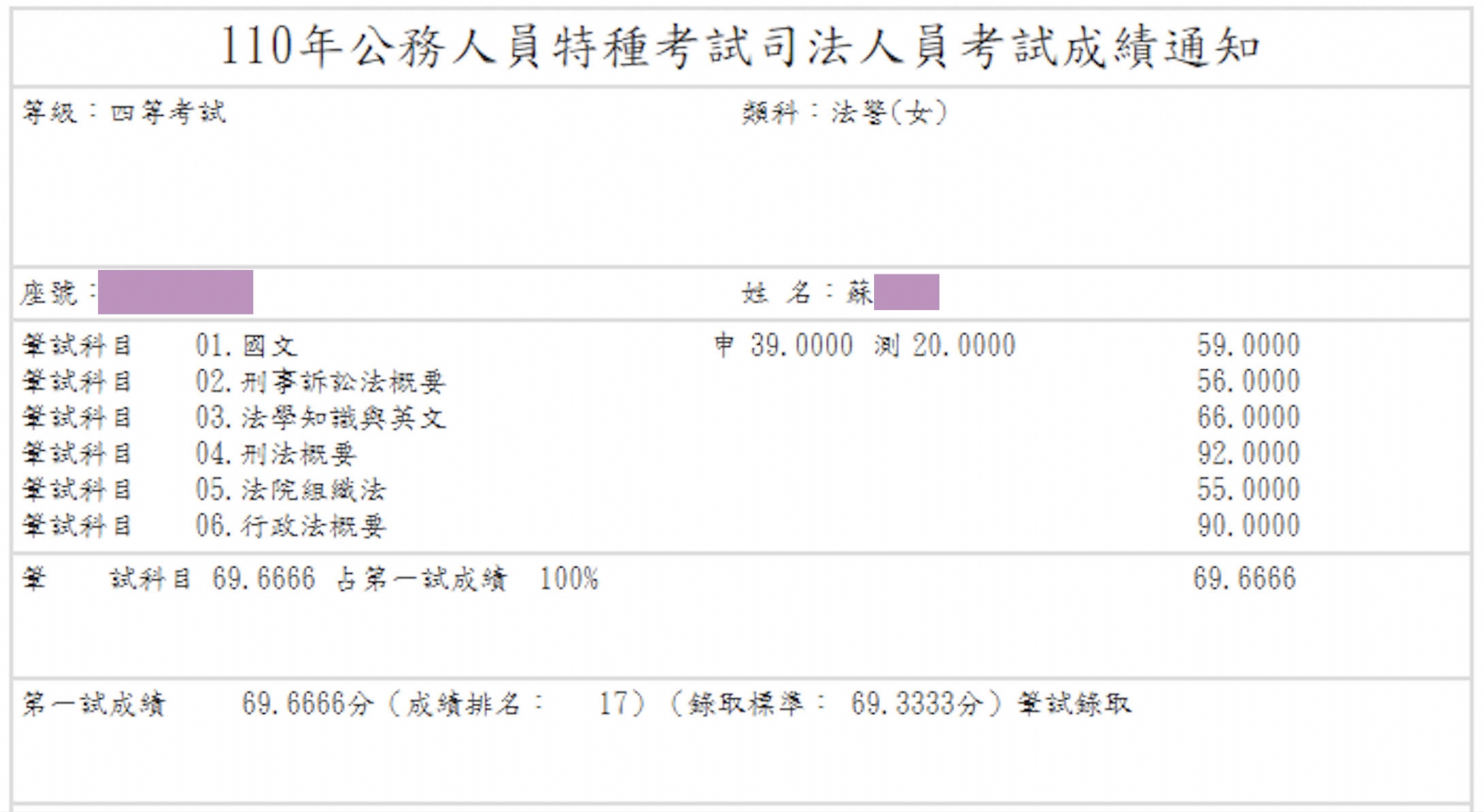 考了四次,嚴格說起來算「三年」。因為在這段期間包含了繁重的大學課業、畢業專題及其上台報告、遇到疫情、服兵役四個月等,諸多影響,也包含專題遇到了雷隊友,讓我時間花了不少在專題上。第一次(非第一年),函授沒有完全看完,成績通知單上也沒有顯示名次;第二次(第一年),函授全部看完,並且有進入練習選擇、申論以及計時的準備程序,以當年第226名落榜;第三次(第二年),則以123名落榜,今年在百名內,上榜。