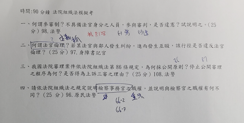 這個科目,應該改個名稱了。除了法院組織法從憲法而來的原理原則外,法條要熟是基本的。另外,從「法規名稱」來看,包含了《法官法》(誠如今年110年的第二題)、《國民法官法》(如109年的第四題)。在訴訟法的部分,有準備刑訴這部分就還好,但會涉及到民事訴訟法,因此我有把民事訴訟法的重要法條列出來(大約有接近二十條,在此附上幾條。如民訴§195、§466、§466-4等)。