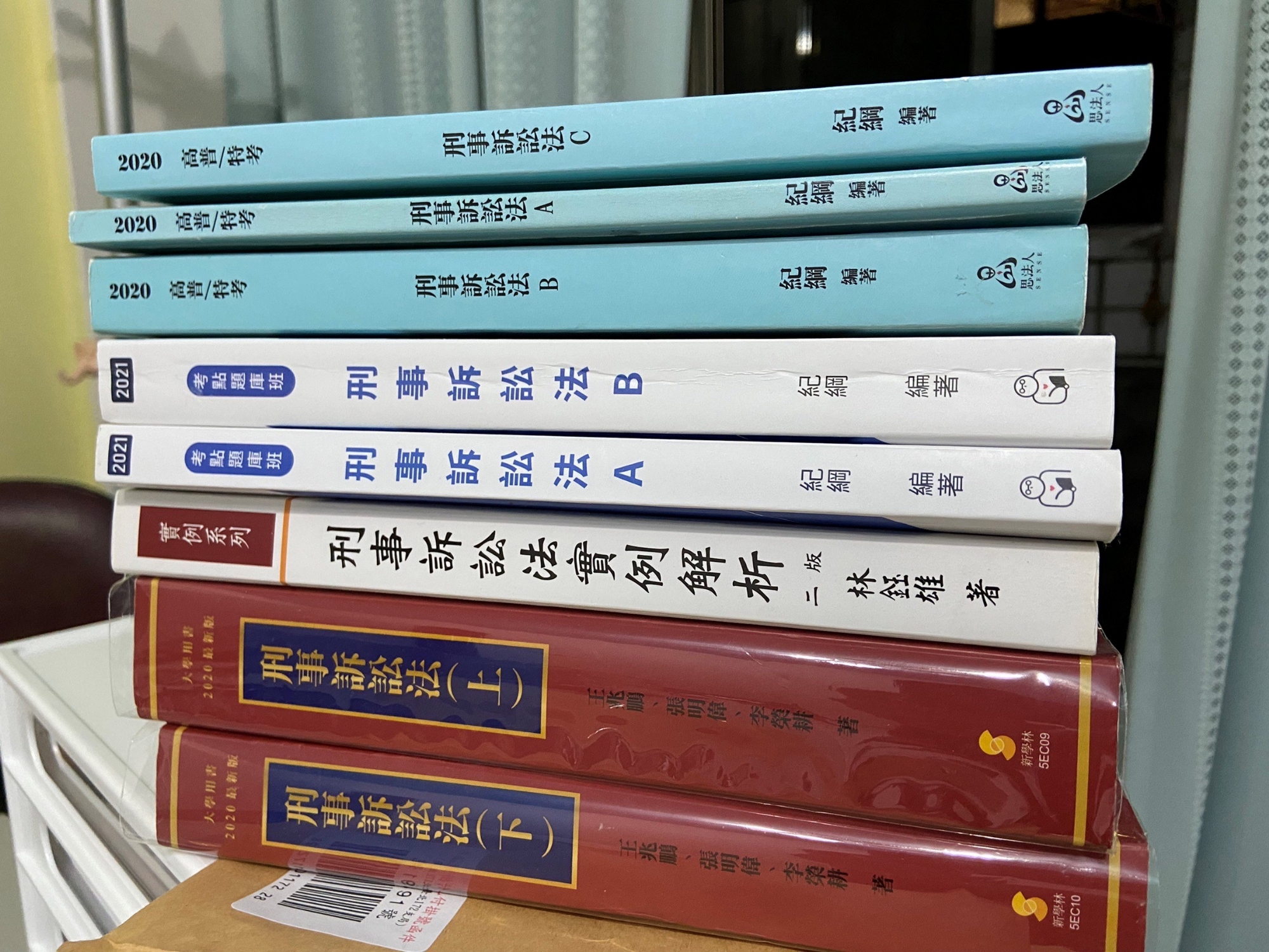 刑訴正課教材及補充講義、考點題庫班教材。另外,我自己還有買林鈺雄老師的紅白書(8版)二手書,刑事訴訟法實例解析(2版)以及王兆鵬老師(三人合著)2020年版教科書。