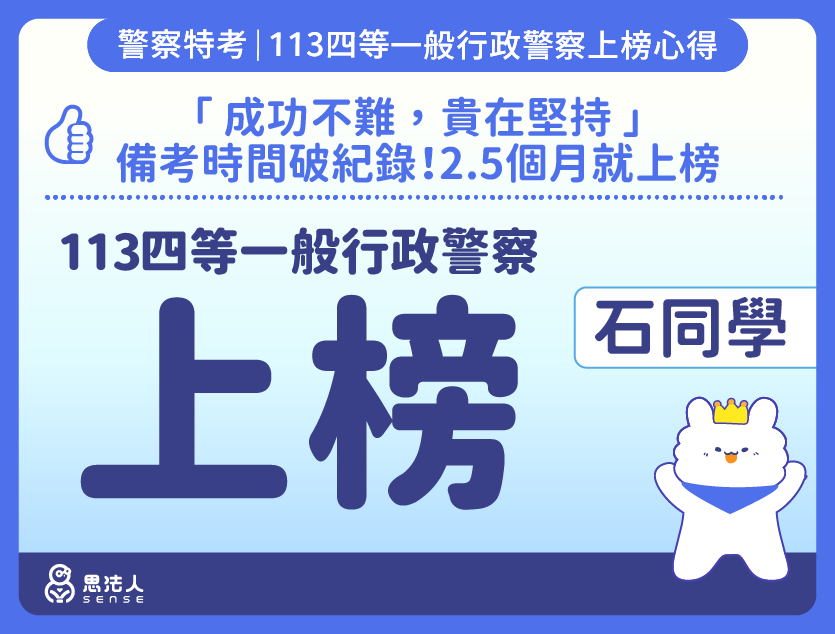 「 成功不難,貴在堅持 」 備考時間破紀錄!2.5個月就上榜 – 113四等一般行政警察 石同學心得
