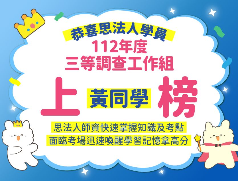 綜上所述,因為考科的關係,英文變得非常重要,務必要掌握到分數。再者,各科的選擇題也成為拉分重點,因此想要上榜的人在上完課程後,除了刷題還是刷題 !至於申論題的部分,非常推薦思法人的老師,不只課本編排用心,老師們的上課內容都很充實,可以快速掌握知識及考點,在複習及考試時能夠迅速喚起記憶並在時間內答題。而心態的部分,一定要告訴自己不可以動搖,特別是在日復一日的枯燥生活中,看到朋友出遊或享樂的當下。最後,祝福大家早日上岸,脫離國考苦海。