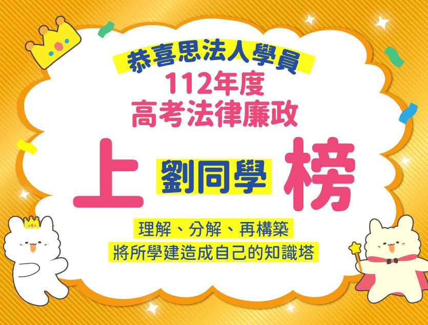 給現在或未來也要準備考試的朋友一些心得,誠如前述自己是兼職考生,平常上班、加班也是對自己相當大的消耗,而自己也並非國立名校出身,雖然時間久了一點但還是藉由思法人的教學和自己不斷的努力讓我成功上榜,條件這麼嚴苛都能上榜,我相信優秀的其他朋友也能在老師的帶領下以及自己的努力下成功踏入新的領域.