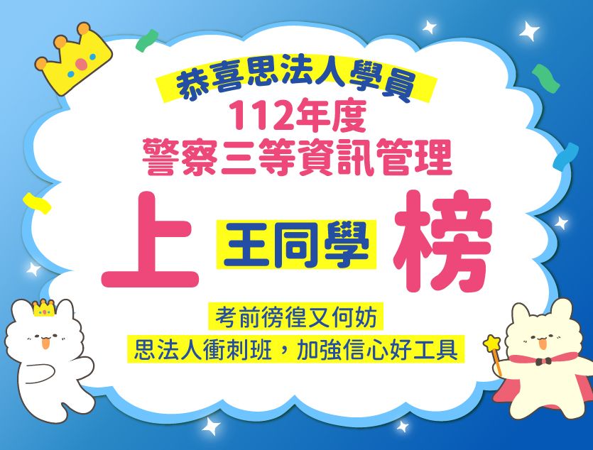 我是參加思法人的警察法規的考前衝刺班,雖然今年的考題沒有符合大眾猜題的警械使用條例等,但警察法規老師考前的叮嚀也有提到基本題型,足以應付此次的申論考題;而情境實務就有新修法的跟騷,在本課堂的考猜有提及。考前衝刺適合在考前沒有信心徬徨時的加強好工具。