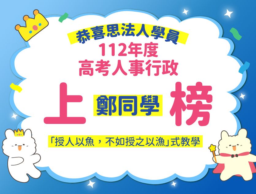 在準備國考時我也想過到底要不要報名補習班,我認為若是以一張白紙的狀態開始備考,有補習班老師帶領來建立各科的架構,真的會是比自己尋找參考書和苦讀來得事半功倍,尤其考科多與時事相關時,老師們會隨時更新法條或實務見解,在準備上就不用擔心自己錯過重要的爭點而較為輕鬆,雖然不是報名補習班就一定會上榜,但思法人不只協助我建立各科的基礎架構,也讓我摸索出適合自己的讀書方式,現在我仍然認為當初報名思法人是很聰明的決定。