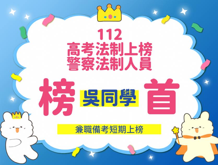 在考完警特後,準備高考法制的時間不到1個月,時間相當受限。準備上,以複習紀綱班內課程為主,練習題目維持手感,並透過各項資源補充法律新知。本次考試成績相較警特低很多,可見高考本身比警特更難,如確定志在高考的考生,或許可以考慮買高考正課課程,並專心於高考。