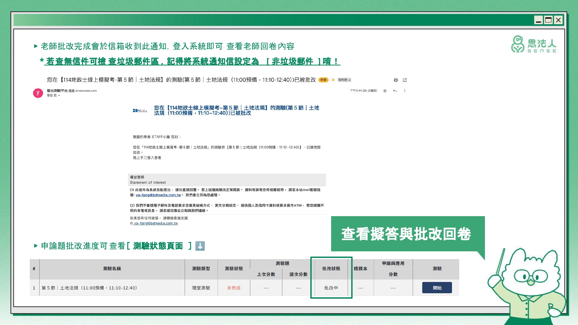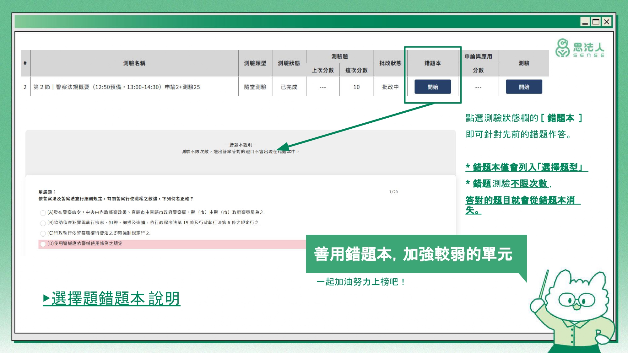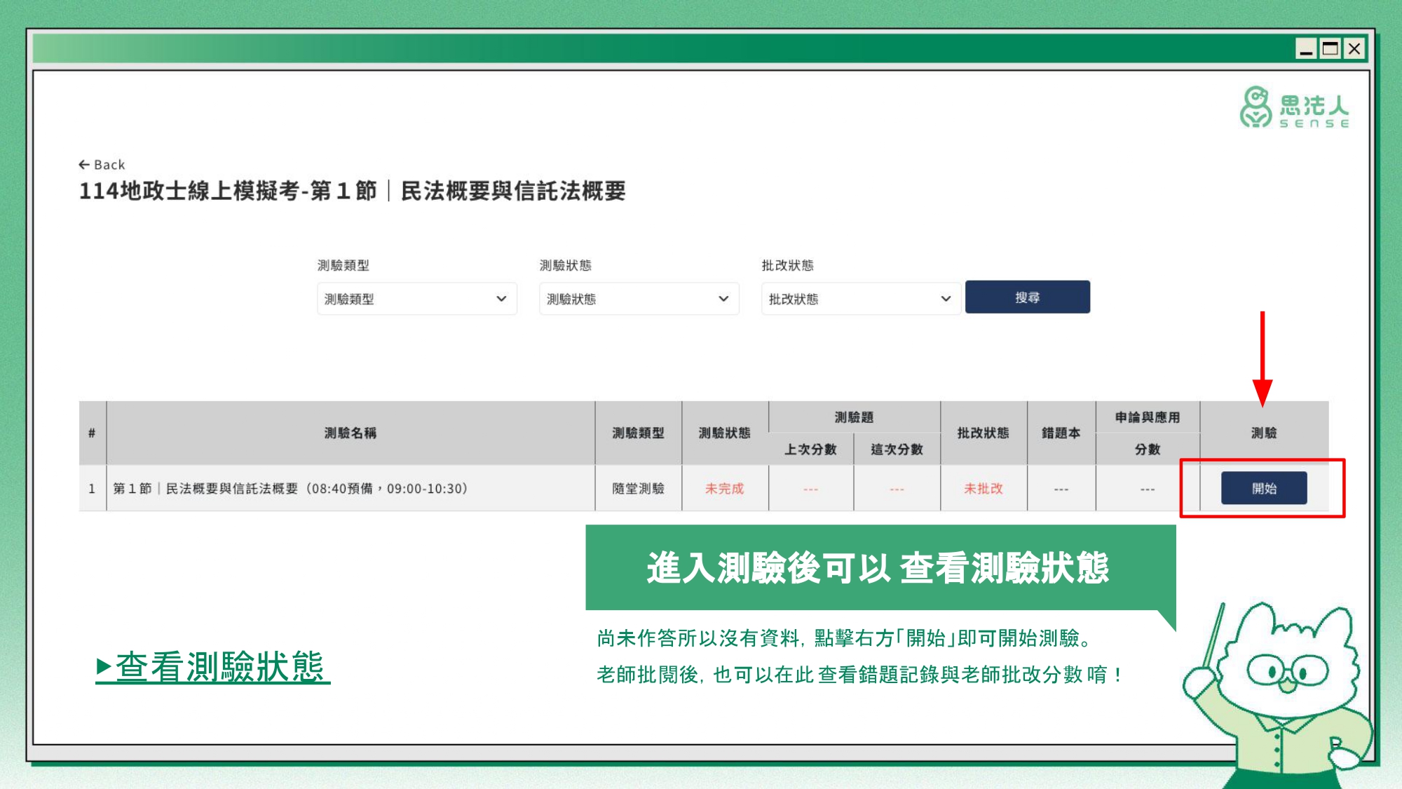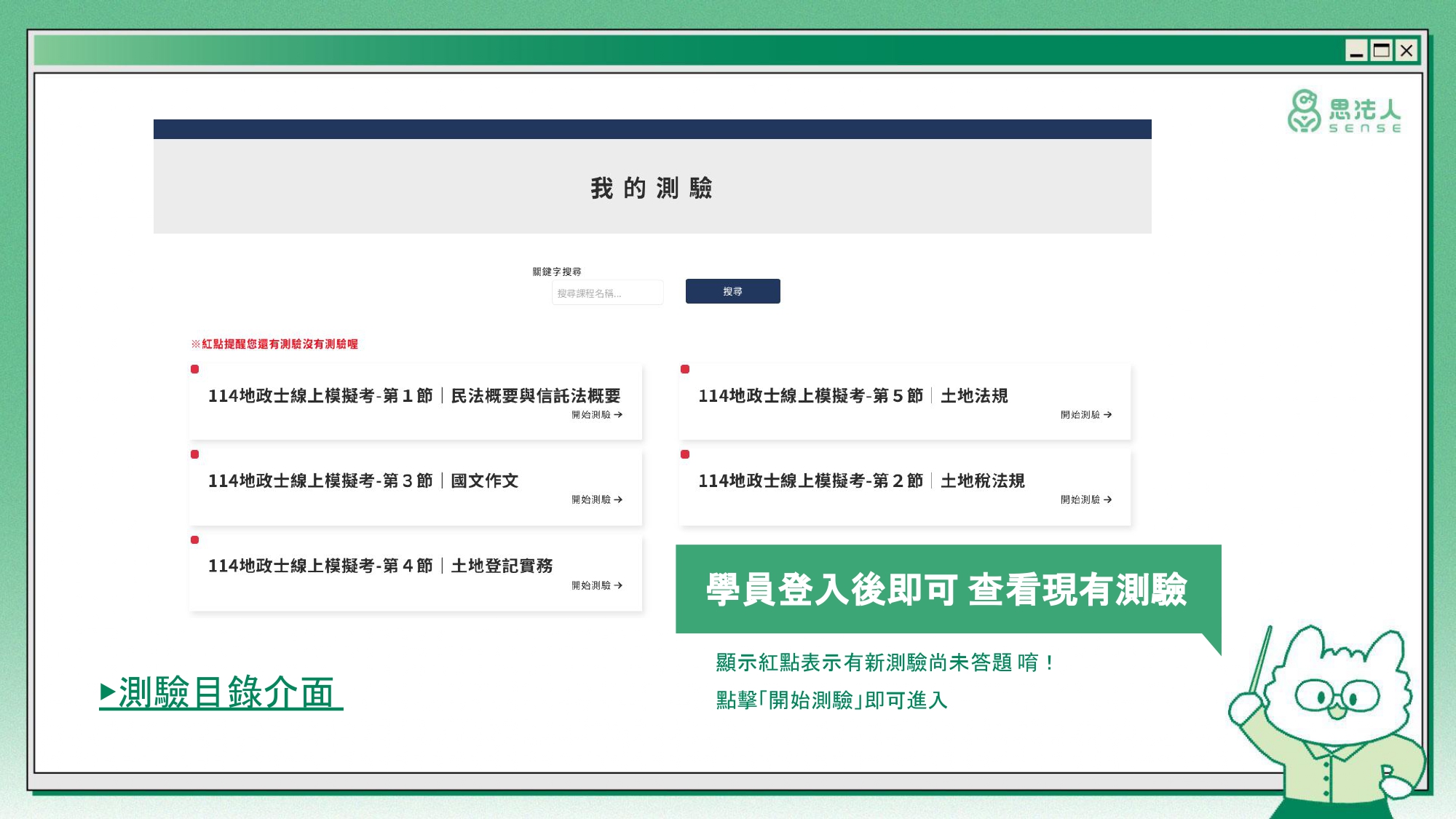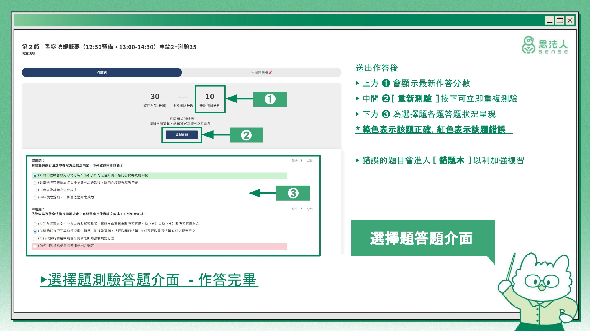 ・同學考畢即可查閱老師詳解擬答,測驗試題於帳號期限內可不限次數重複練習。