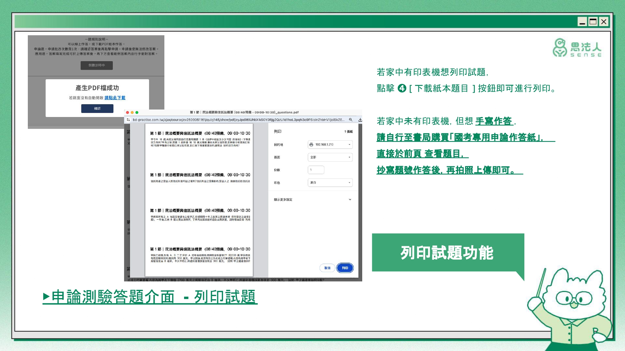 ・同學可自行至書局採購國考專用申論+測驗作答紙(國文另有指定規格),並依照考試期程自行計時作答練習。