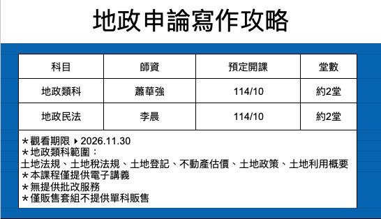 地政士、不動產經紀人、不動產估價師、高考地政、普考地政、雙照課程、三照課程