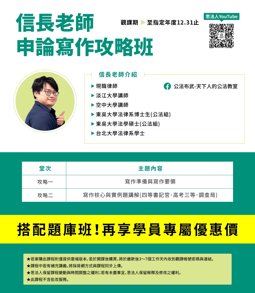 另有學科申論寫作攻略班,合購享優惠,詳情請洽: